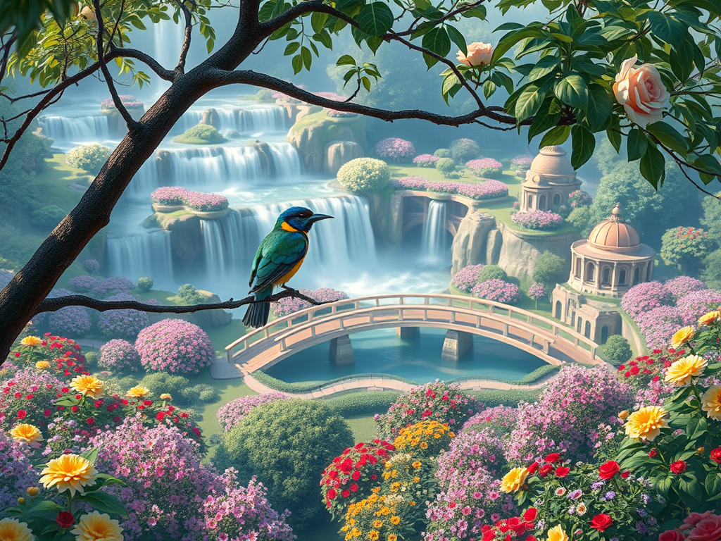 Once at dusk while flying over a well fortified powerful kingdom a strange sound wafted to his ears and, looking down, he spotted well manicured lawns and gardens with carefully structured pools and bridges. He’d never seen so fine a garden and so he swooped silently down and, as soon as his feet touched a branch, he transformed himself into a songbird.