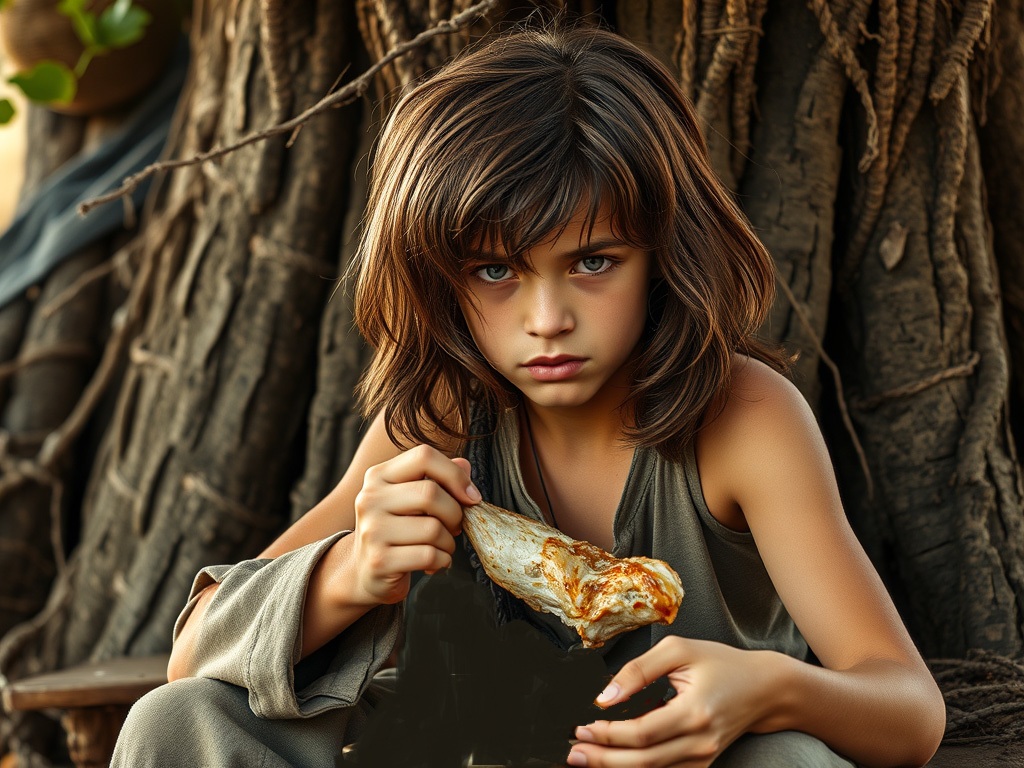 Simon quickly picked himself up from where he’d collapsed panting from the exertion. Reminded of his growling stomach, he wanted the same. Looking wistful at the yummy morsel, he licked his chops and asked: “Where did you get that meat?”