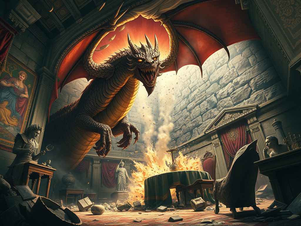 Suddenly an explosive roar was heard that shook the palace down to the deepest dungeons. A blinding flash of lightning lit up the room just before clouds of roiling smoke obscured the view. The Great Dragon had just crashed through part of the roof and, with a small twitch of his mighty tail, demolished the outside stone wall. When the dust and debris settled the Dragon looked out over the fallen tapestries, broken statues and splintered furniture trying to find the Duke.