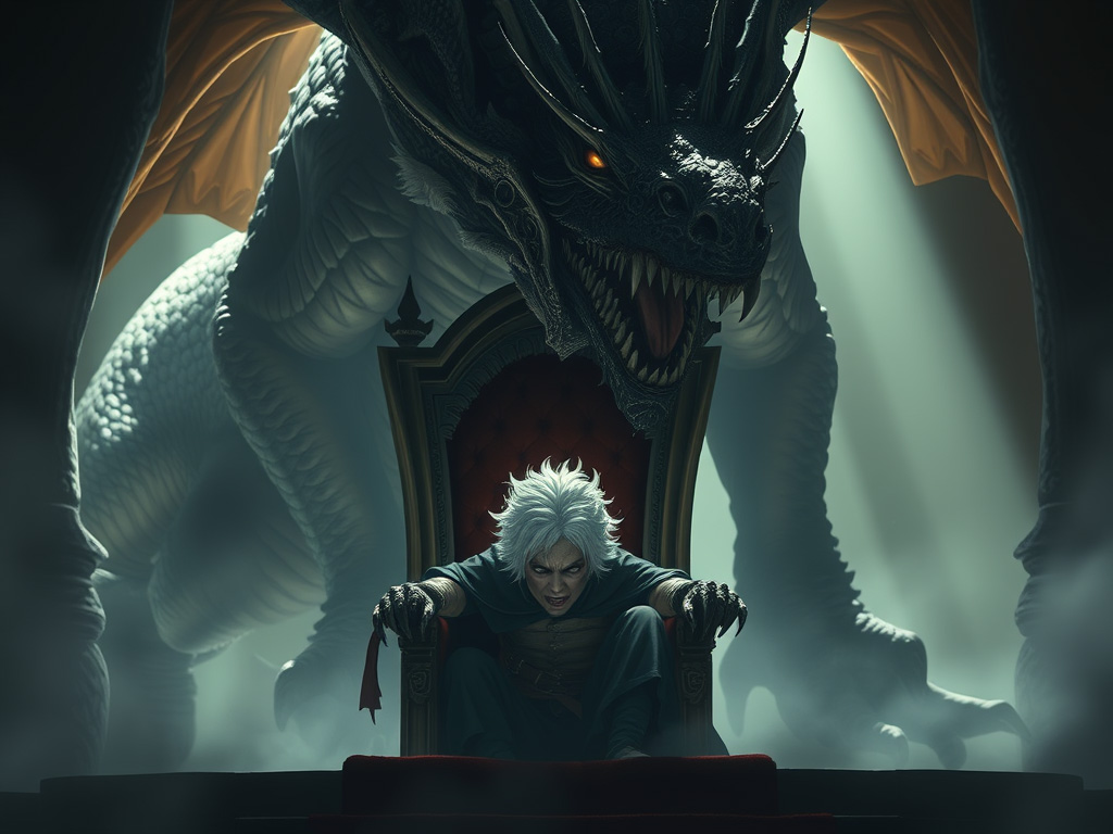 “There you are!” The Dragon puffed the throne aside, uncovering the paralyzed, cowering Duke among the shattered remains of his Dragon treasure, his face hidden and eyes averted from the real Dragon that towered over him.