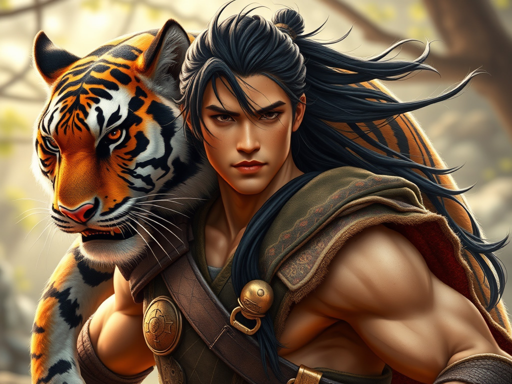 Dschou Tschu at once took off and ran all the way without stopping till he reached the hills. There he hunted the tiger out of his cave. The latter leaped into the air so that the whole forest was shaken as though by a storm. Next he came rushing up, roaring, and stretching out his claws savagely to seize his pray. Dschou nimbly stepped back a pace, and the tiger landed on the ground directly in front of him. Then he thrust the tiger’s neck to the ground with his left hand, and beat him without stopping with his right, until he lay dead on the earth. Dschou loaded the tiger on his back and went straight home.