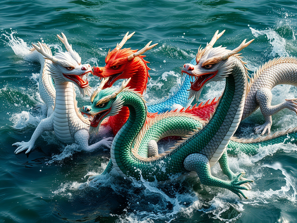 Her sisters wanted nothing to do with these slithering creatures and again teased her incessantly for her odd attraction to them. She pleaded with her parents to be allowed to keep them, promising to bear the sole responsibility of feeding them, caring for them and keeping them out of trouble. Although they were a poor family Wen Shi saved the best portions of her own food and diligently fed these morsels by hand to the baby snakes. She carried them with her always, even when doing her chores. Soon the snakes grew up under her good care, and loving her in return, they assisted her whenever they could with her chores. These unusually intelligent snakes were quite adept in the water and excellent swimmers; therefore, they used their ability to help Wen Shi catch bountiful loads of fish in the Xi River. Then a time came when another wonder manifested; the snakes matured into five magnificent and most powerful dragons.