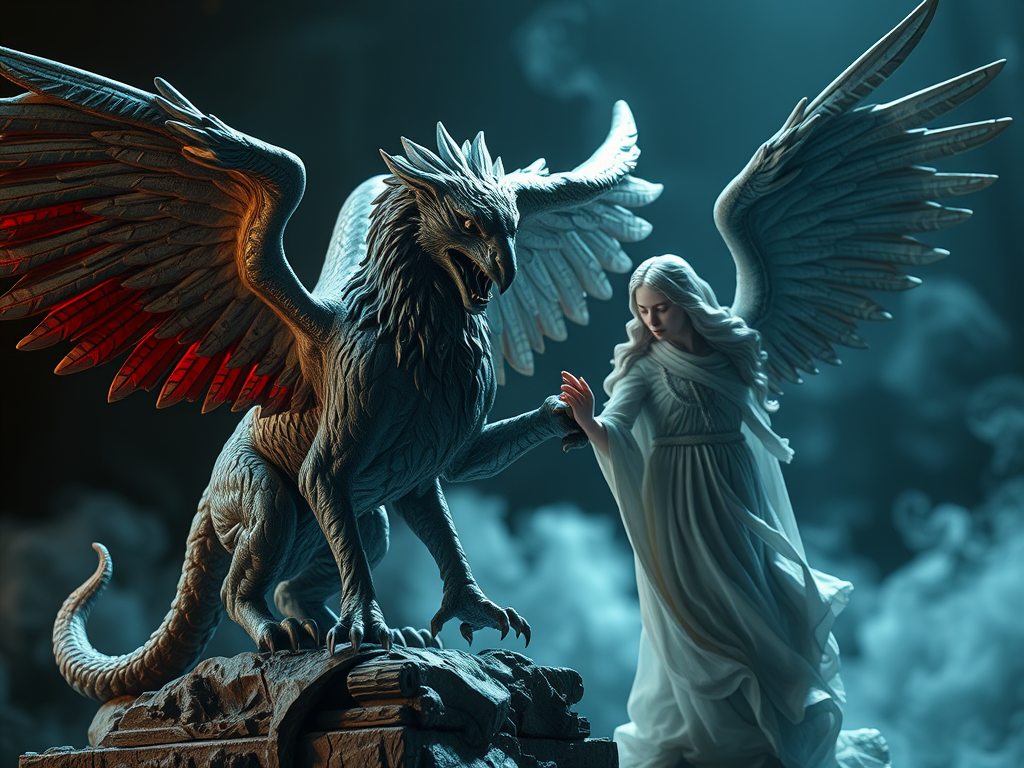 And the griffin, waking suddenly from his dreams, twisted his large neck around to look for the lion, saw a lion’s flank, and fastened its eagle beak in it. For the griffin had been artificially made by the King-enchanter, and the two halves had never really got used to each other. So now the eagle half of the griffin, who was still rather sleepy, believed that it was fighting a lion, and the lion part, being half asleep, thought it was fighting an eagle, and the whole griffin in its deep drowsiness hadn’t the sense to pull itself together and remember what it was made of. So the griffin rolled over and over, one end of it fighting with the other, till the eagle end pecked the lion end to death, and the lion end tore the eagle end with its claws till it died. And so the griffin that was made of a lion and an eagle perished, exactly as if it had been made of Kilkenny cats.