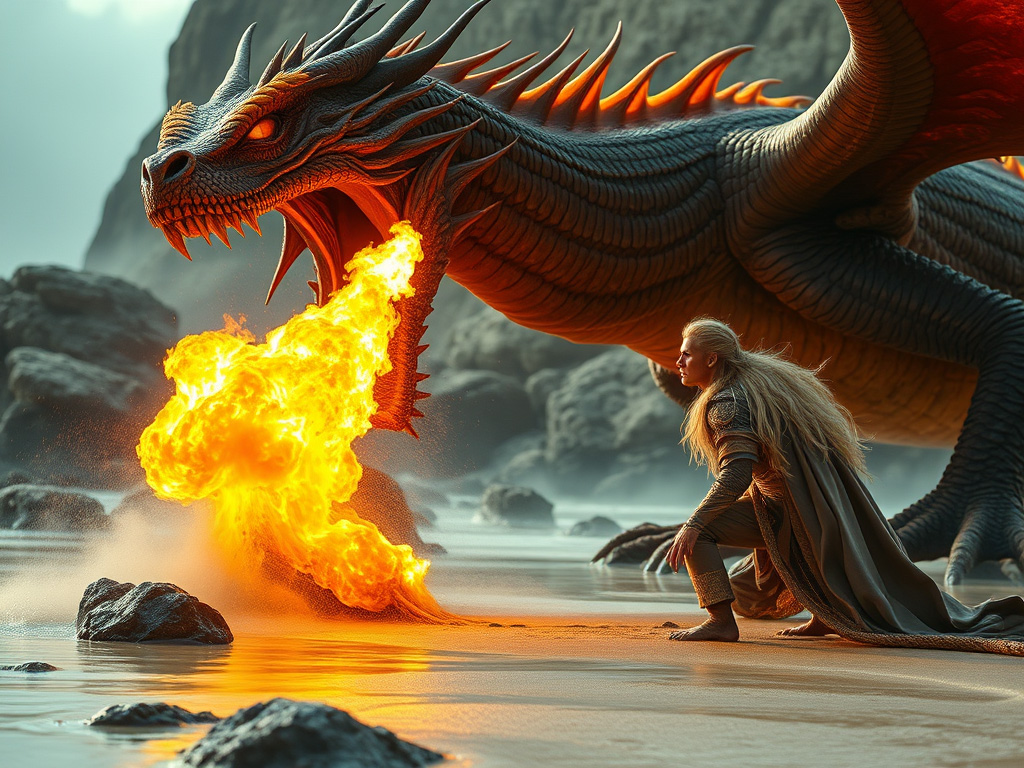 The dragon was clambering down the face of the cliff, and next moment he was crawling and writhing and sprawling and wriggling across the beach after Nigel, making great holes in the sand with his heavy feet—and the very end of his tail, where there were no legs, made, as it dragged, a mark in the sand such as you make when you launch a boat; and he breathed fire till the wet sand hissed again, and the water of the little rock pools got quite frightened, and all went off in steam.