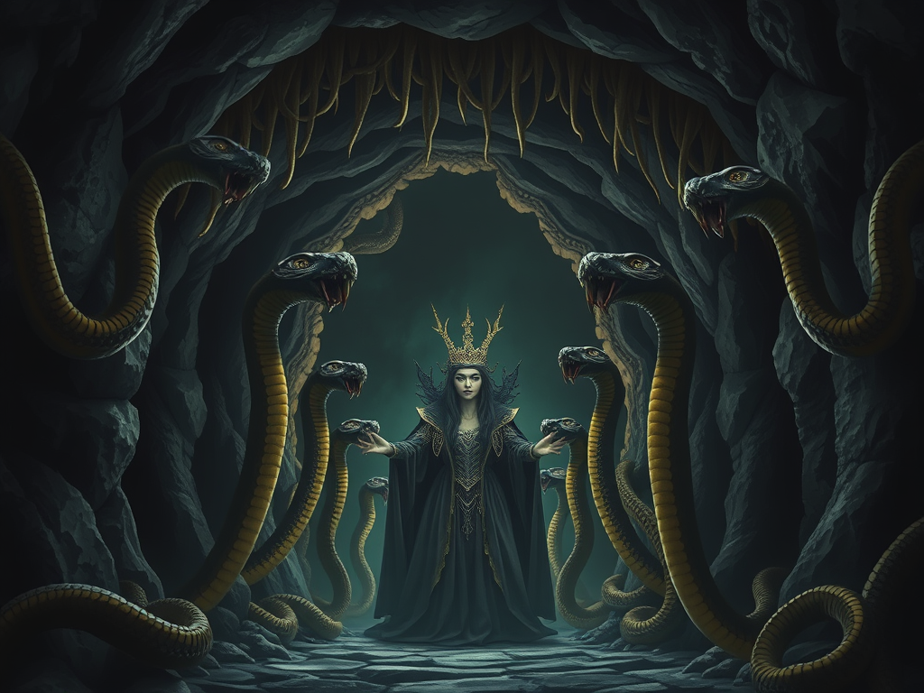 The dark arch that led to the witch’s cave was hung with a black-and-yellow fringe of live snakes. As the Queen went in, keeping carefully in the middle of the arch, all the snakes lifted their wicked, flat heads and stared at her with their wicked, yellow eyes. You know it is not good manners to stare, even at Royalty, except of course for cats. And the snakes had been so badly brought up that they even put their tongues out at the poor lady. Nasty, thin, sharp tongues they were too.