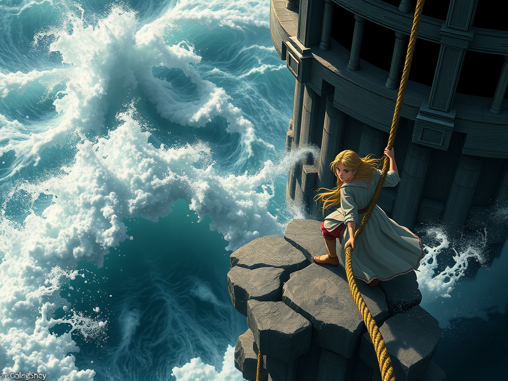 Then the skipper said: “All good things defend you, Nigel, from sailing near that light. It is not mentioned in all charts; but it is marked in the old chart I steer by, which was my father’s father’s before me, and his father’s father’s before him. It is the light that shines from the Lone Tower that stands above the Nine Whirlpools. And when my father’s father was young, he heard from the very old man, his great-great-grandfather, that in that tower an enchanted Princess, fairer than the day, waits to be delivered. But there is no deliverance, so never steer that way; and think no more of the Princess, for that is only an idle tale. But the whirlpools are quite real.”