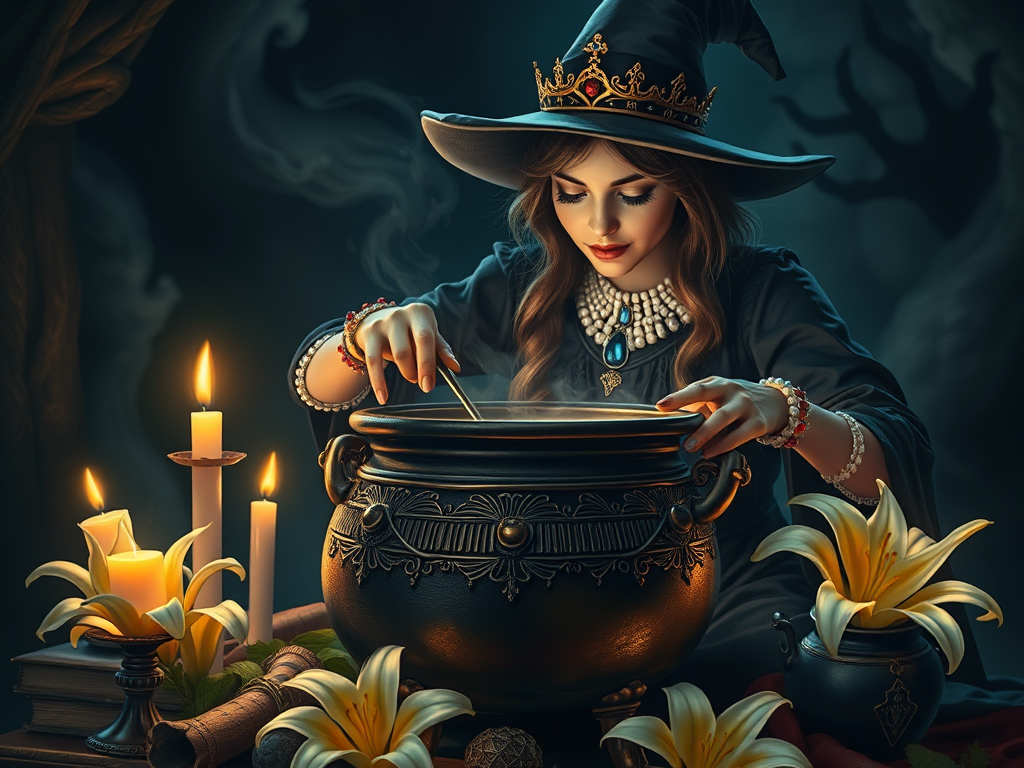 Then the witch stirred the stuff that was in the cauldron, and, one by one, she threw in the gold crown and the sapphire necklace and the pearl bracelets and the ruby clasps and the diamonds of the little bright shoe buckles, and last of all she threw in the lilies.