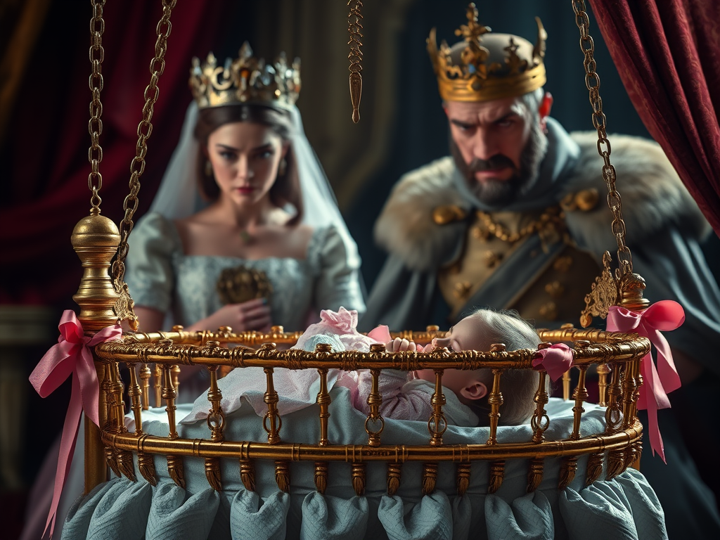 When the Queen got home, sure enough there was the baby lying in the cradle with the Royal arms blazoned on it, crying as naturally as possible. It had pink ribbons to tie up its sleeves, so the Queen saw at once it was a girl. When the King knew this he tore his black hair with fury.