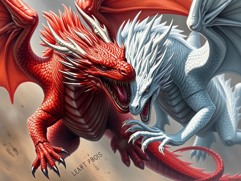The instructions were obeyed, and two sleeping serpents were discovered. Once exposed to the air the creatures changed into Dragons and began to fight upon the silk tent. The white dragon raised himself on his hind legs and threw the other into the middle of the tent, then drove him back to the edge. Three times the white dragon assailed the red and three times the red, apparently the weaker of the two, was driven to the edge of the tent. In a turn of events the red dragon recovered his strength and threw the white dragon completely off from the tent and into the pool. Here the pursuit continued, and both dragons disappeared into the bottom. Once the dragons were seen no more the boy turned to the councillors and asked them what meaning they put to the actions of the dragons. Perplexed, they again admitted their ignorance.