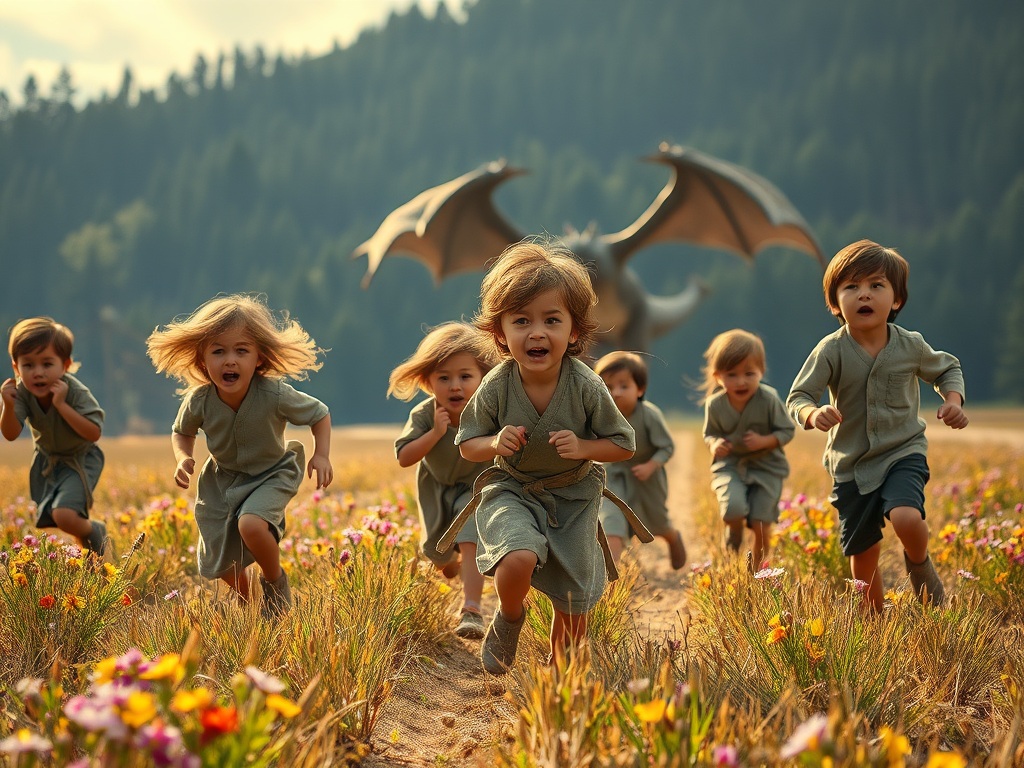 Then quite suddenly a cloud passed over the sun, and the silence was broken by shrieks from far off; and, like a many-colored torrent, all the children burst from the woods (forest) and rushed, a red and blue and yellow and white wave, across the field, screaming as they ran. Their voices came up to the Princess on her tower, and she heard the words threaded on their screams like beads on sharp needles: “The dragon, the dragon, the dragon! Open the gates! The dragon is coming! The fiery dragon!”