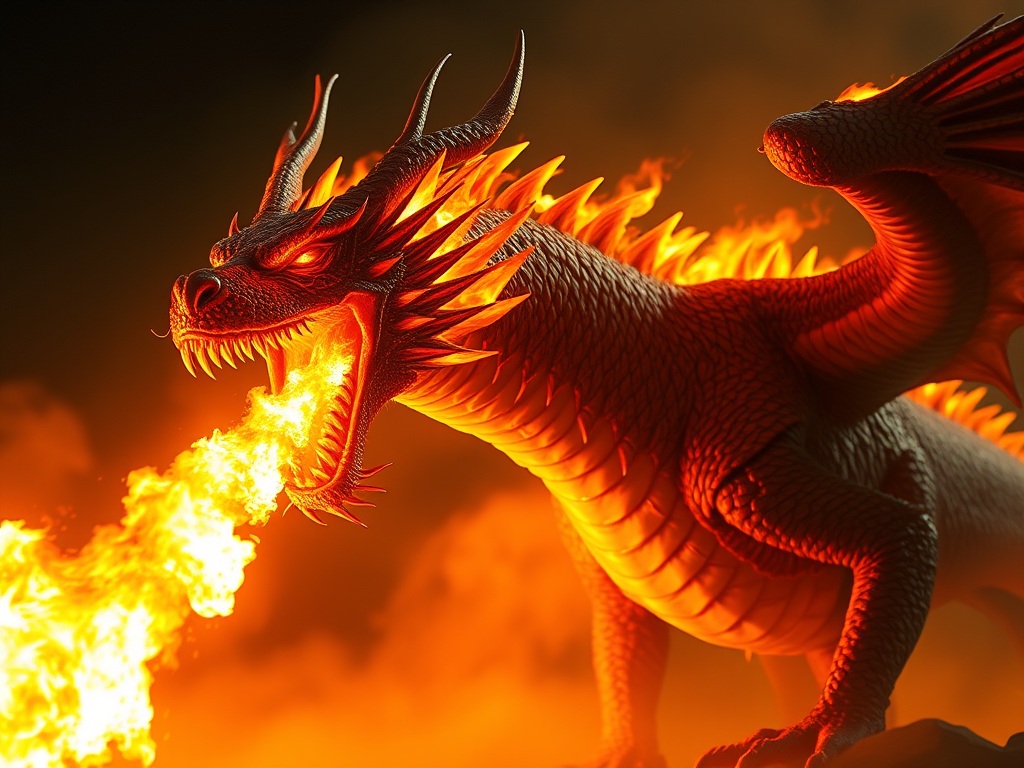 But just as the prince was beginning to think there was no dragon at all, but only a cock and bull story, his favourite old hippopotamus gave tongue. The prince blew his horn and shouted: “Tally ho! Hark forward! Tantivy!” and the whole pack charged downhill toward the hollow by the wood, prince thinking only of future fame and glory, to annihilate the dragon and destroy his refuge. Forced into defending mode, the Dragon confronted them; however, he did so in manifest form as big as a barge, glowing like a furnace, and spitting fire and showing razor sharp teeth.