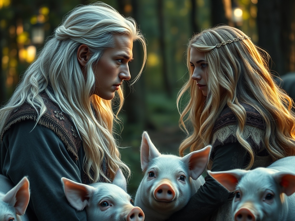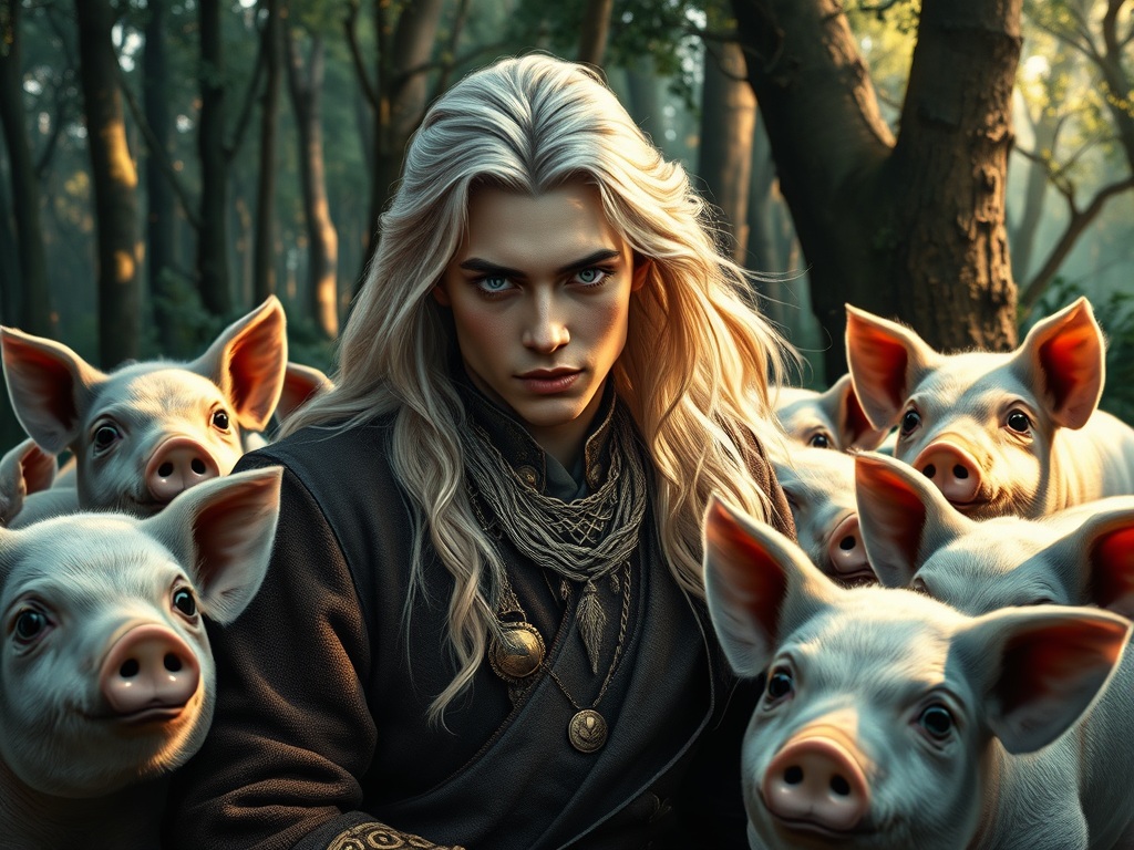 SShe, without thought, had simply ran right into the thickest part of the dense forest; perhaps, it was to fulfill her yearning secret desire for any adventure; or perhaps it was fate, leading her steps towards what she was meant to go. And lo and behold, there in a dell she suddenly came upon Elfin and his five and seventy fine pigs. He was idly sitting by, playing his flute, and around him the pigs were dancing cheerfully on their hind legs.