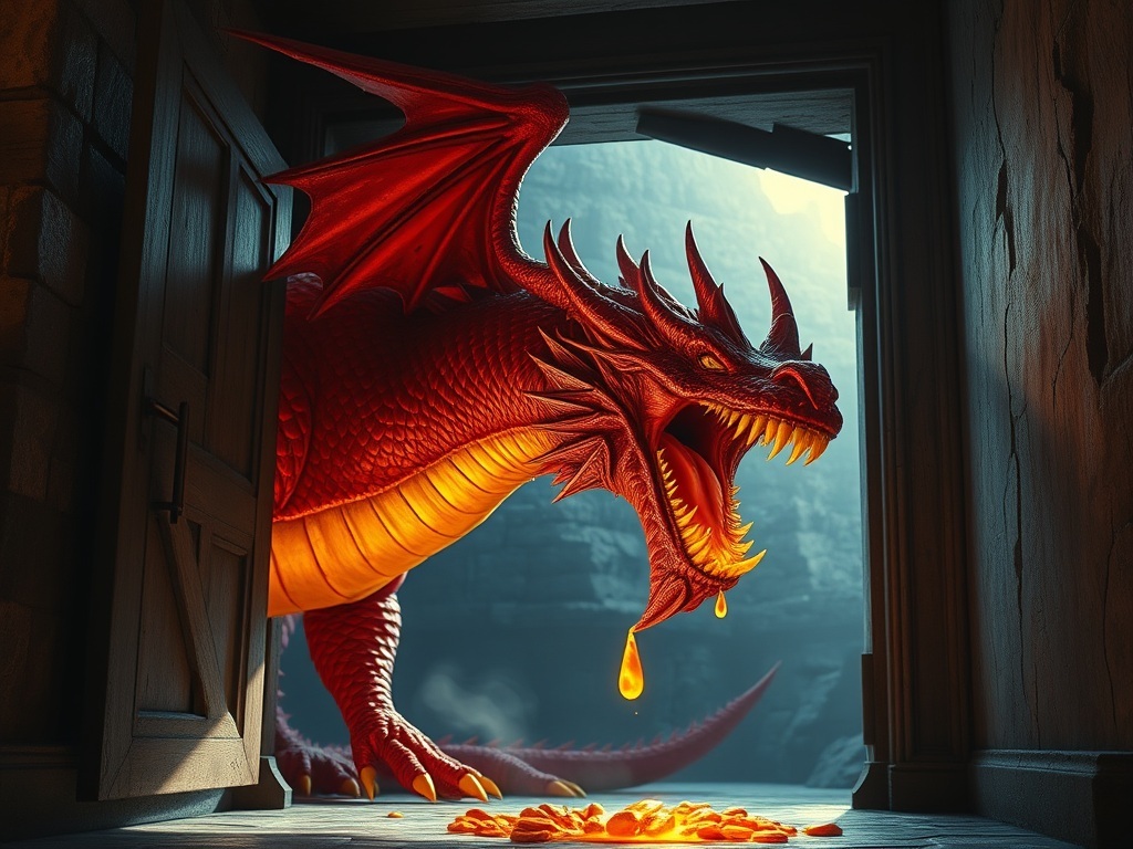 By breakfast-time he had devoured the whole of the prince’s treasures, and when the prince came along, his feet nearing the treasury building, around the bend, he came face to face with the dragon coming out of the broken door of the Treasury, with molten gold still dripping from his jaws.