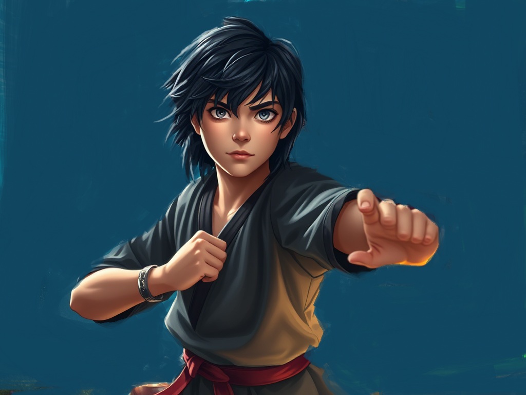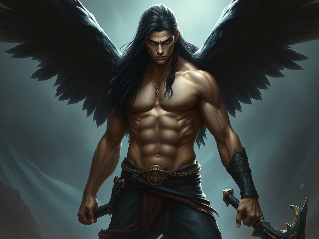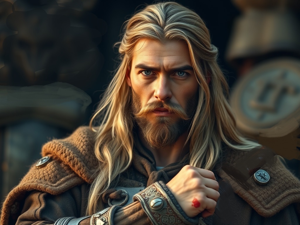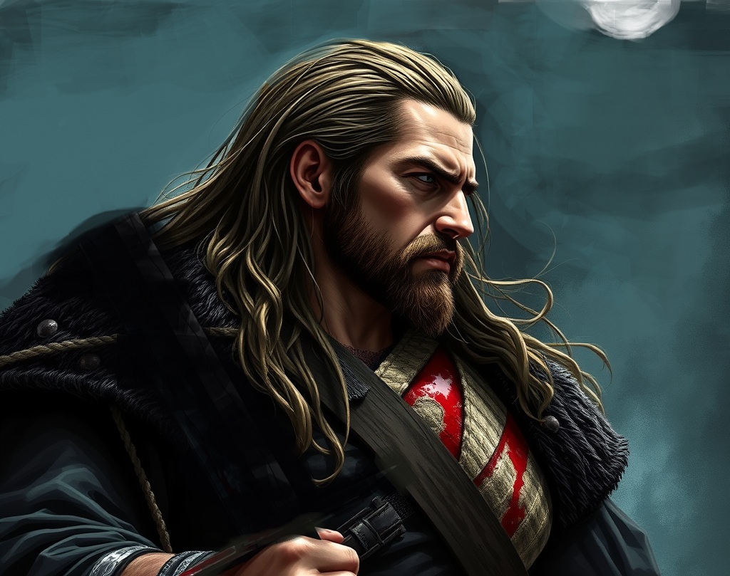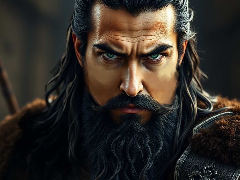 As they approached the dwelling, suddenly the door creaked open and an intimidating, over seven feet tall, brawny (muscular), stalwart warrior, though he was dressed in plain clothes, with long raven black hair past his broad shoulders that filled the door-frame, briskly stepped outside (emerged from the door); he cast a long, assessing (scrutinizing), stern look at Stevor then shifted his angry gaze to rest on the boy.