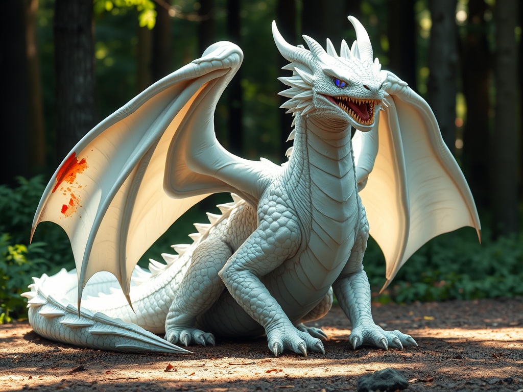 But when Stevor got to the pillar, he saw that he would not need to climb to the top to find out what the wolf ‘s howl was about. For there, by the pillar, lay a white dragon. And it was a child dragon, a toddler, no more than three dragon years. Though he was not a full-grown dragon, comparatively, he was still immense in size. His wings were like big umbrellas, with some crumpling, as though soggy, and much rained on, and his eyes were brilliant blue which was unusual for a dragon, and his tail was very, very, very long and thin and tight, like the lash of a carriage whip.