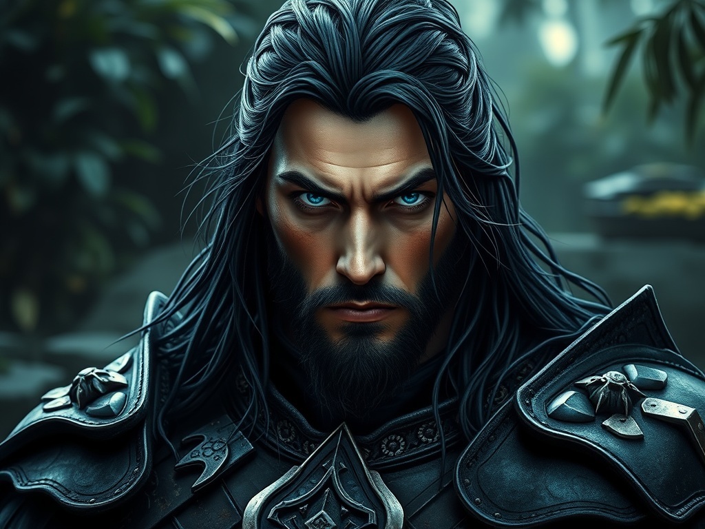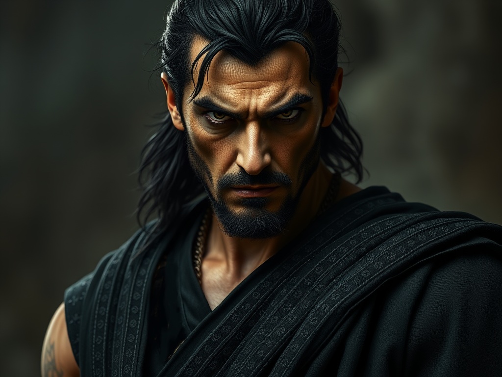 His path, however, was abruptly (instantly) blocked by the menacing looking dark warrior, who stood his ground with an unyielding, menacing stance (posture).